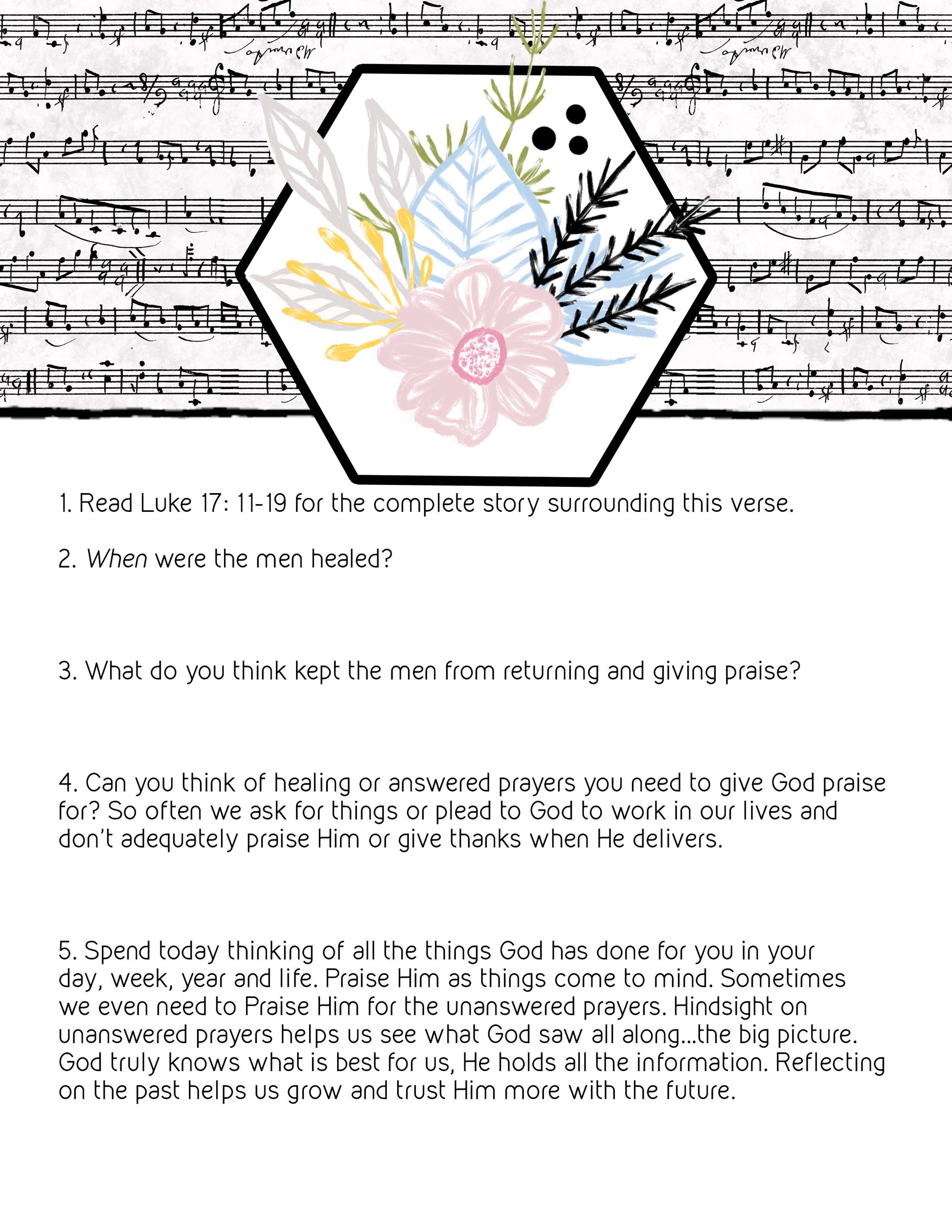 Do you praise God continuously? Do you praise him before he acts? after? during? when the outcome is good? when times are hard? when the prognosis is bad? regardless of the outcome? This digital download workbook was created to help you spend five days shifting your sight to praising God in EVERYTHING.
